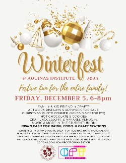 Enjoy festive fun for the entire family! There will be family and kid friendly crafts, artwork displays (and artwork for sale), Christmas photo corner (and Santa may stop by), hot chocolate and cookies, craft/accessory/apparel vendors, music and so much more! Please bring cash for drink, food, and craft stations. Winterfest is a fundraising event for Aquinas' NAHS to raise funds for artwork and supplies to revamp art displays throughout the entire building. Part of the proceeds will also go to a local non-profit organization.